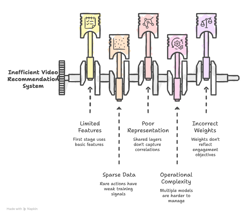 Candidate: I’d design this as a multi-stage recommendation pipeline. There are fundamentally two problems here: (1) retrieving a manageable candidate set from a massive video corpus, and (2) ranking those candidates precisely. These have different computational budgets and objectives, so they should be separate stages.