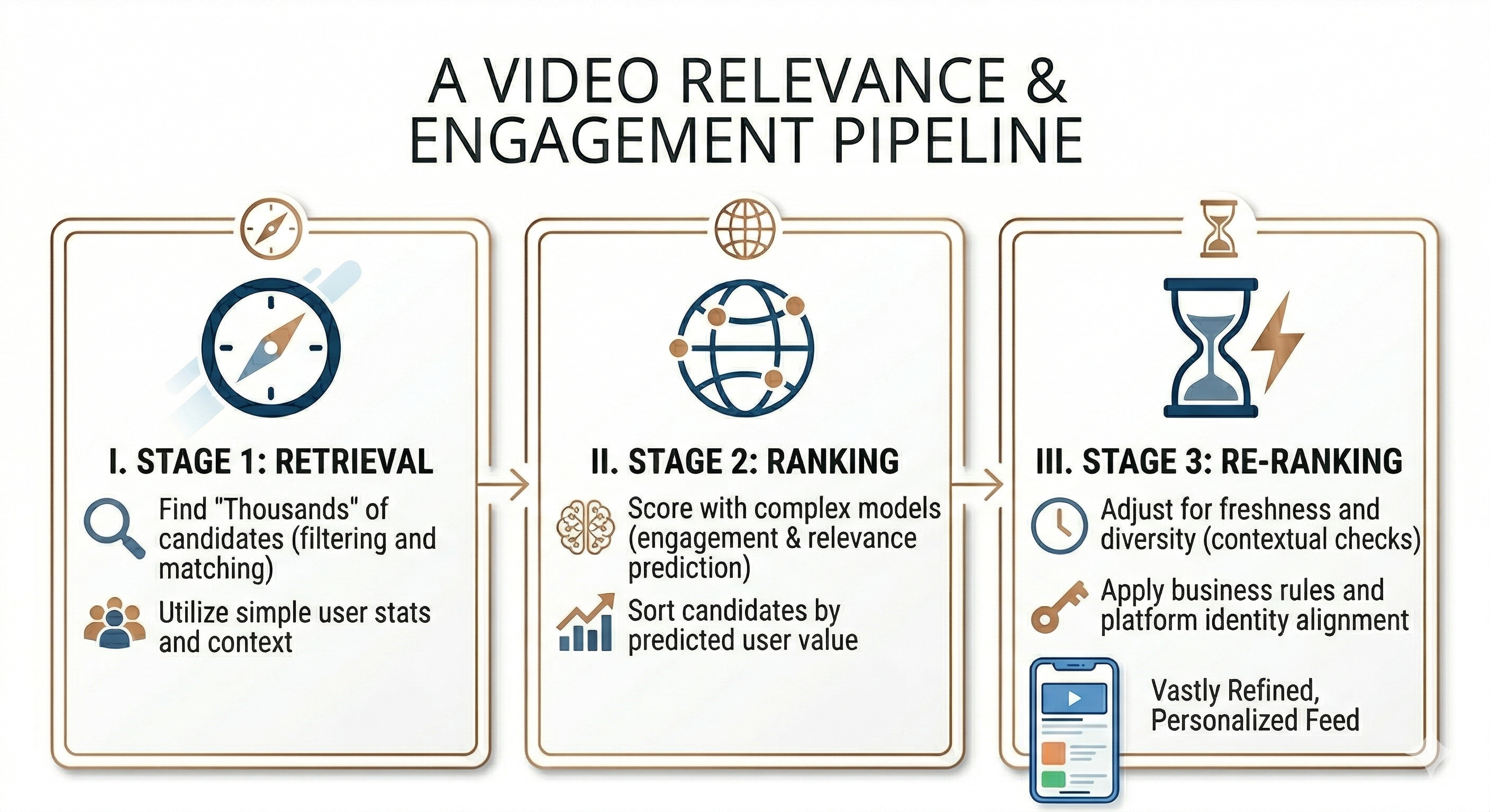 I’ll walk through: Retrieval → Ranking → Re-ranking & Business Rules → Serving. Does that structure work?